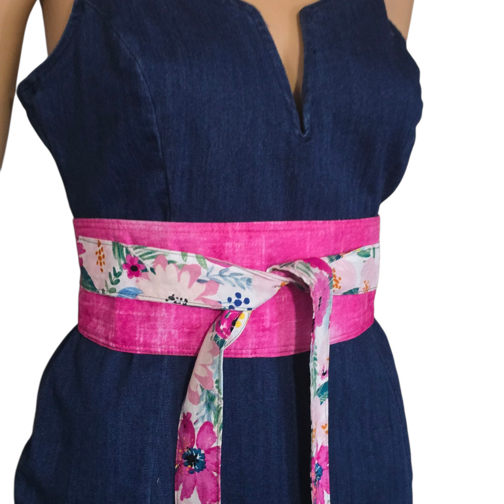 Handmade reversible obi belt with floral cotton print and solid reverse. Adjustable wrap design, perfect for styling dresses, tunics, and everyday looks.